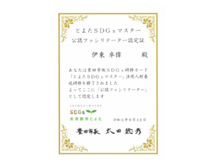2023.09.12 SDGsマスター 公認ファシリテーター認定 豊田市版SDGs研修カード「とよたSDGsマスター」 活用人材研修を修了し「公認ファシリテーター」として 弊社の代表が認定されましたのでご報告します。 松平中学校の生徒様に体験していただきSDGs活動の 貢献に寄与しています。 詳細はこちら 2023.05.17 とよたSDGsパートナー とよたSDGsパートナーとして登録されました。 豊田市 とよたSDGsパートナーとして登録されました 豊田市のSDGsに関する施策に積極的に参加していきます。 詳細はこちら 2021.10.29 令和3年度 愛知県建設局優良工事に選定されました 道路改良工事8号工の工事において令和3年度愛知県建設局優良工事に選定されました。数々の工事の中から受賞できたことに感謝いたします。またこの受賞は多くの協力会社の方々のお力添えであり、この場をお借りして深く御礼申し上げます。今後も引き続き安全に留意し更なる飛躍を目指していきたいと考えています。ありがとうございました。 詳細はこちら 2017.04.27 健康宣言チャレンジ事業所 健康宣言チャレンジ事業所として認定されました 更なる取り組みに向けてチャレンジしていきます。 健康宣言チャレンジ 詳細はこちら 投稿ナビゲーション << 1 2 3